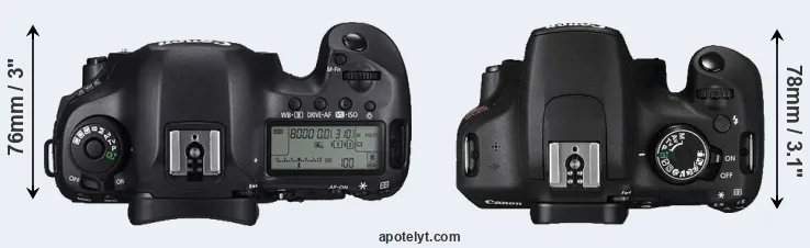 An illustration of the physical size and weight of the Canon 5DS and the Canon T5 is provided in the side-by-side display below. The two cameras are presented according to their relative size. Three consecutive views from the front, the top, and the rear side are shown. All width, height and depth measures are rounded to the nearest millimeter.