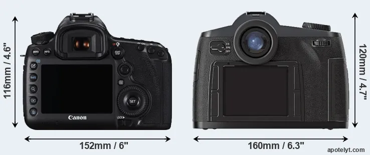 The side-by-side display below illustrates the physical size and weight of the Canon 5DS and the Leica S2. The two cameras are presented according to their relative size. Three consecutive views from the front, the top, and the rear side are shown. All width, height and depth measures are rounded to the nearest millimeter.