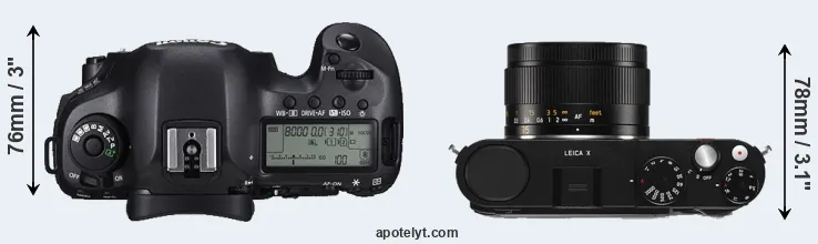 The side-by-side display below illustrates the physical size and weight of the Canon 5DS and the Leica X Typ 113. The two cameras are presented according to their relative size. Three successive views from the front, the top, and the rear are shown. All width, height and depth dimensions are rounded to the nearest millimeter.