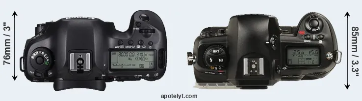 The physical size and weight of the Canon 5DS and the Nikon D1 are illustrated in the side-by-side display below. The two cameras are presented according to their relative size. Three successive views from the front, the top, and the rear are shown. All width, height and depth measures are rounded to the nearest millimeter.
