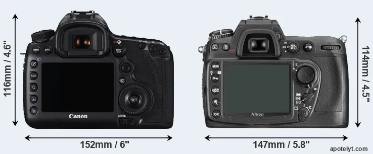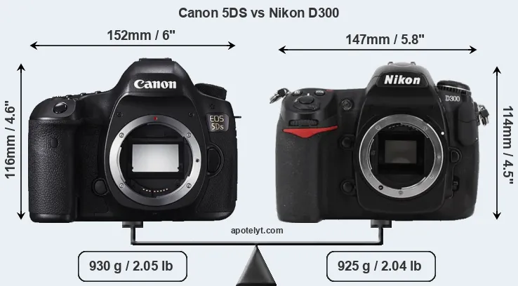 The physical size and weight of the Canon 5DS and the Nikon D300 are illustrated in the side-by-side display below. The two cameras are presented according to their relative size. Three consecutive perspectives from the front, the top, and the back are available. All size dimensions are rounded to the nearest millimeter.