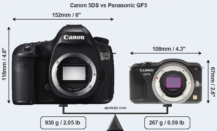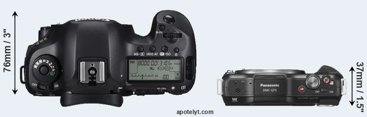 The physical size and weight of the Canon 5DS and the Panasonic GF5 are illustrated in the side-by-side display below. The two cameras are presented according to their relative size. Three consecutive perspectives from the front, the top, and the back are available. All size dimensions are rounded to the nearest millimeter.