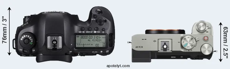 The side-by-side display below illustrates the physical size and weight of the Canon 5DS and the Sony A7C R. The two cameras are presented according to their relative size. Three successive views from the front, the top, and the rear are shown. All width, height and depth dimensions are rounded to the nearest millimeter.