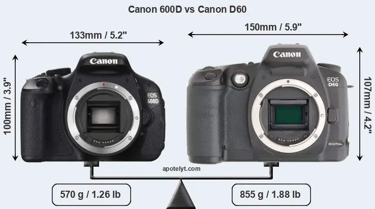 The side-by-side display below illustrates the physical size and weight of the Canon 600D and the Canon D60. The two cameras are presented according to their relative size. Three successive views from the front, the top, and the rear are shown. All size dimensions are rounded to the nearest millimeter.