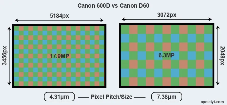 Despite having a slightly smaller sensor, the Canon 600D offers a higher resolution of 17.9 megapixels, compared with 6.3 MP of the Canon D60. This megapixels advantage comes at the cost of a higher pixel density and a smaller size of the individual pixel (with a pixel pitch of 4.31μm versus 7.38μm for the D60). However, it should be noted that the 600D is much more recent (by 8 years and 11 months) than the D60, and its sensor will have benefitted from technological advances during this time that make it possible to gather light more efficiently.