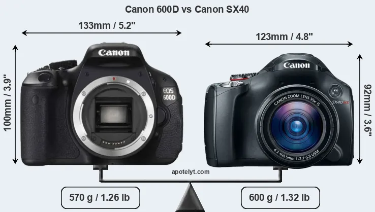 The physical size and weight of the Canon 600D and the Canon SX40 are illustrated in the side-by-side display below. The two cameras are presented according to their relative size. Three consecutive perspectives from the front, the top, and the back are available. All width, height and depth dimensions are rounded to the nearest millimeter.