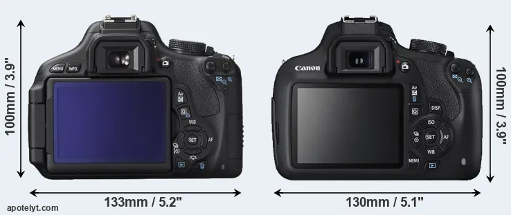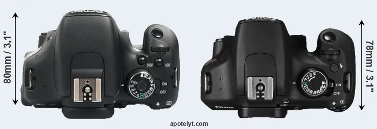 The side-by-side display below illustrates the physical size and weight of the Canon 600D and the Canon T5. The two cameras are presented according to their relative size. Three successive views from the front, the top, and the rear are shown. All size dimensions are rounded to the nearest millimeter.