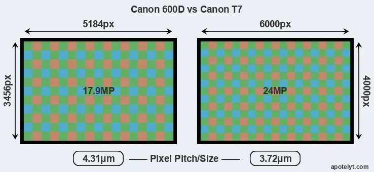 While the two cameras under review share the same sensor size, the T7 offers a higher resolution of 24 megapixels, compared with 17.9 MP of the 600D. This megapixels advantage translates into a 16 percent gain in linear resolution. On the other hand, these sensor specs imply that the T7 has a higher pixel density and a smaller size of the individual pixel (with a pixel pitch of 3.72μm versus 4.31μm for the 600D). However, it should be noted that the T7 is much more recent (by 7 years) than the 600D, and its sensor will have benefitted from technological advances during this time that compensate for the smaller pixel size.
