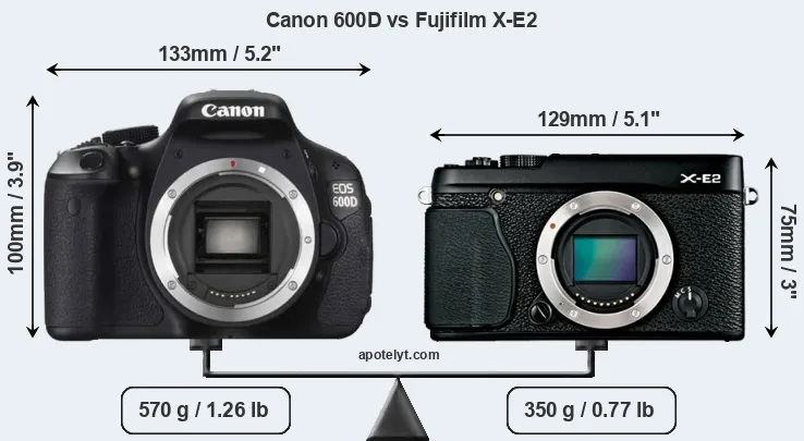 The physical size and weight of the Canon 600D and the Fujifilm X-E2 are illustrated in the side-by-side display below. The two cameras are presented according to their relative size. Three consecutive perspectives from the front, the top, and the back are available. All width, height and depth dimensions are rounded to the nearest millimeter.