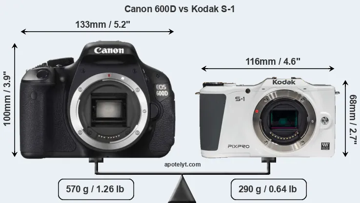 An illustration of the physical size and weight of the Canon 600D and the Kodak S-1 is provided in the side-by-side display below. The two cameras are presented according to their relative size. Three consecutive views from the front, the top, and the rear side are shown. All size dimensions are rounded to the nearest millimeter.