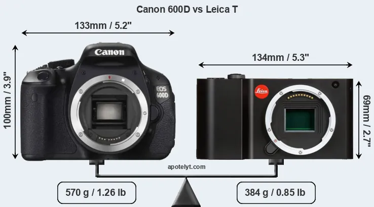 The physical size and weight of the Canon 600D and the Leica T are illustrated in the side-by-side display below. The two cameras are presented according to their relative size. Three successive views from the front, the top, and the rear are shown. All width, height and depth measures are rounded to the nearest millimeter.