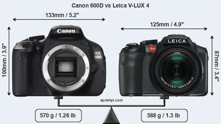 An illustration of the physical size and weight of the Canon 600D and the Leica V-LUX 4 is provided in the side-by-side display below. The two cameras are presented according to their relative size. Three successive views from the front, the top, and the rear are shown. All width, height and depth measures are rounded to the nearest millimeter.