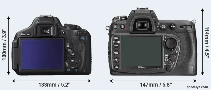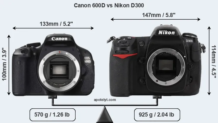 The physical size and weight of the Canon 600D and the Nikon D300 are illustrated in the side-by-side display below. The two cameras are presented according to their relative size. Three consecutive views from the front, the top, and the rear side are shown. All width, height and depth measures are rounded to the nearest millimeter.