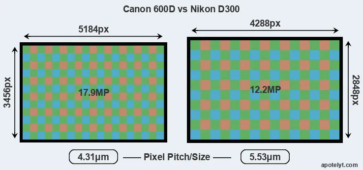 Despite having a smaller sensor, the Canon 600D offers a higher resolution of 17.9 megapixels, compared with 12.2 MP of the Nikon D300. This megapixels advantage comes at the cost of a higher pixel density and a smaller size of the individual pixel (with a pixel pitch of 4.31μm versus 5.53μm for the D300). However, it should be noted that the 600D is much more recent (by 3 years and 5 months) than the D300, and its sensor will have benefitted from technological advances during this time that make it possible to gather light more efficiently.