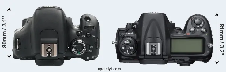 An illustration of the physical size and weight of the Canon 600D and the Nikon D300S is provided in the side-by-side display below. The two cameras are presented according to their relative size. Three successive views from the front, the top, and the rear are shown. All width, height and depth measures are rounded to the nearest millimeter.
