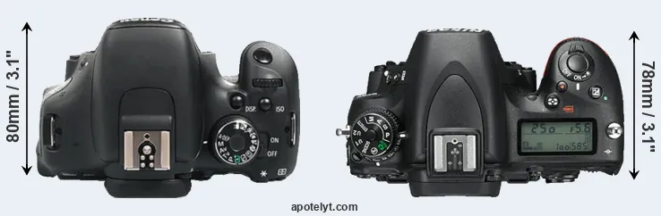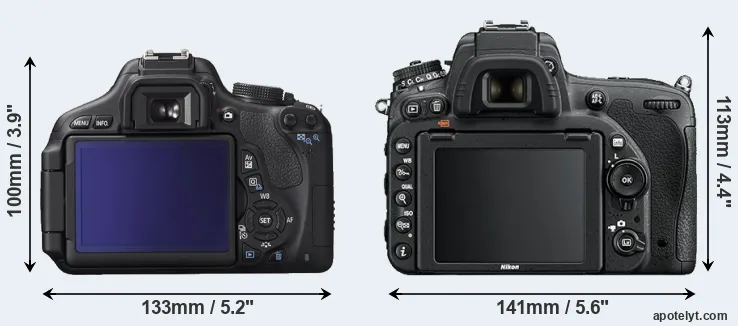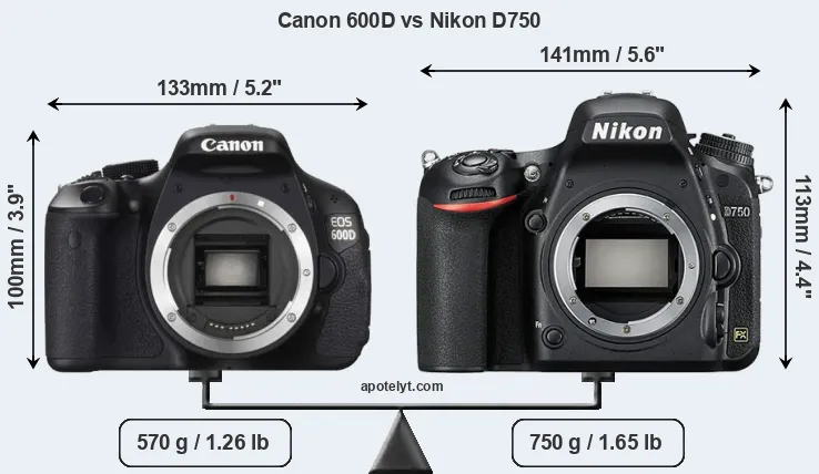 The physical size and weight of the Canon 600D and the Nikon D750 are illustrated in the side-by-side display below. The two cameras are presented according to their relative size. Three consecutive perspectives from the front, the top, and the back are available. All width, height and depth measures are rounded to the nearest millimeter.