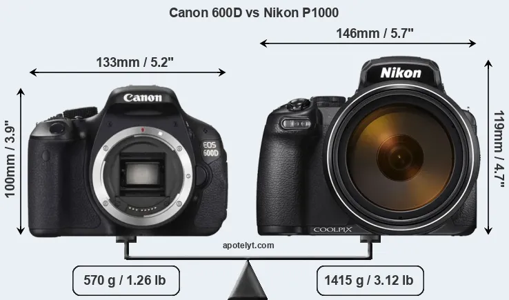 An illustration of the physical size and weight of the Canon 600D and the Nikon P1000 is provided in the side-by-side display below. The two cameras are presented according to their relative size. Three consecutive perspectives from the front, the top, and the back are available. All size dimensions are rounded to the nearest millimeter.