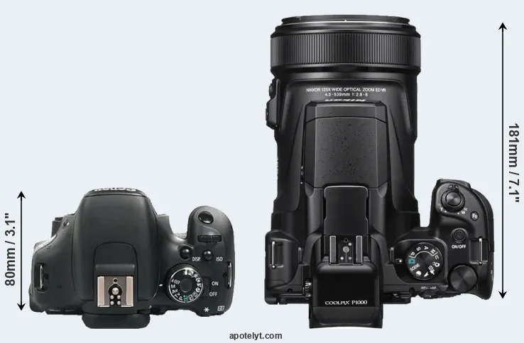 The above size and weight comparisons are to some extent incomplete and possibly misleading, as the P1000 has a lens built in, whereas the 600D is an interchangeable lens camera that requires a separate lens. Attaching the latter will add extra weight and bulk to the setup. You can compare the optics available for the 600D and their specifications in the Canon EF Lens Catalog.