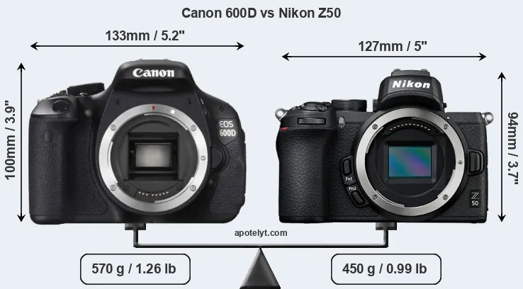 The physical size and weight of the Canon 600D and the Nikon Z50 are illustrated in the side-by-side display below. The two cameras are presented according to their relative size. Three consecutive views from the front, the top, and the rear side are shown. All width, height and depth measures are rounded to the nearest millimeter.