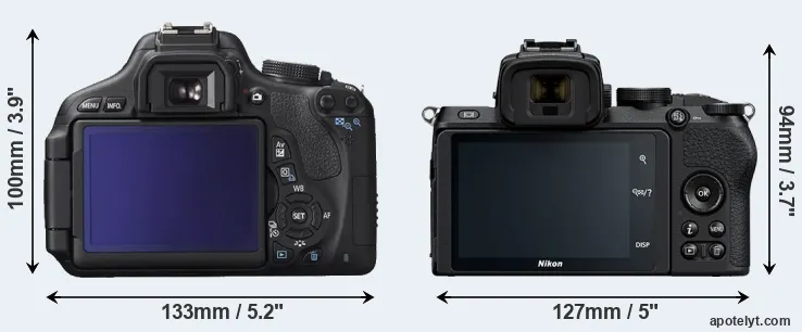 Going beyond this snapshot of core features and characteristics, what are the differences between the Canon EOS 600D and the Nikon Z50? Which one should you buy? Read on to find out how these two cameras compare with respect to their body size, their imaging sensors, their shooting features, their input-output connections, and their reception by expert reviewers.