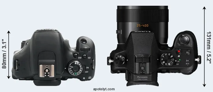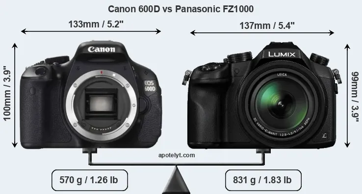 The side-by-side display below illustrates the physical size and weight of the Canon 600D and the Panasonic FZ1000. The two cameras are presented according to their relative size. Three consecutive perspectives from the front, the top, and the back are available. All width, height and depth measures are rounded to the nearest millimeter.
