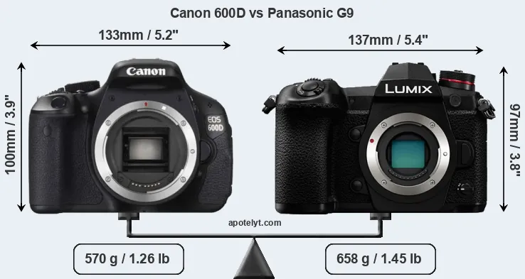 The physical size and weight of the Canon 600D and the Panasonic G9 are illustrated in the side-by-side display below. The two cameras are presented according to their relative size. Three successive views from the front, the top, and the rear are shown. All width, height and depth measures are rounded to the nearest millimeter.