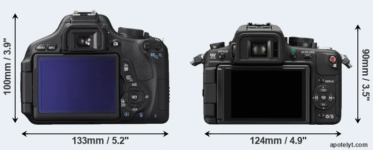 The physical size and weight of the Canon 600D and the Panasonic GH1 are illustrated in the side-by-side display below. The two cameras are presented according to their relative size. Three consecutive perspectives from the front, the top, and the back are available. All width, height and depth dimensions are rounded to the nearest millimeter.