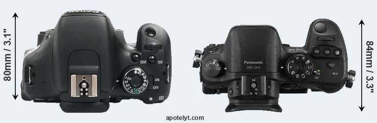 An illustration of the physical size and weight of the Canon 600D and the Panasonic GH4 is provided in the side-by-side display below. The two cameras are presented according to their relative size. Three consecutive views from the front, the top, and the rear side are shown. All width, height and depth measures are rounded to the nearest millimeter.