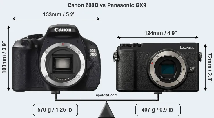 If the front view area (width x height) of the cameras is taken as an aggregate measure of their size, the Panasonic GX9 is considerably smaller (33 percent) than the Canon 600D. Moreover, the GX9 is markedly lighter (29 percent) than the 600D. In this context, it is worth noting that neither the 600D nor the GX9 are weather-sealed.