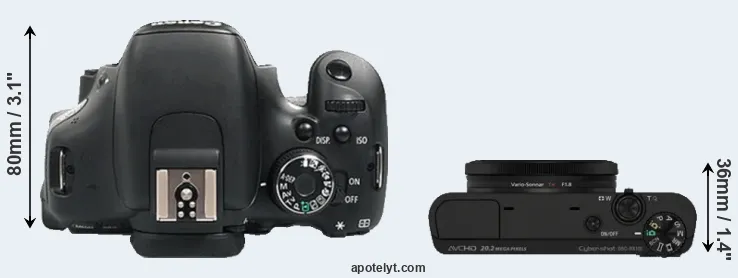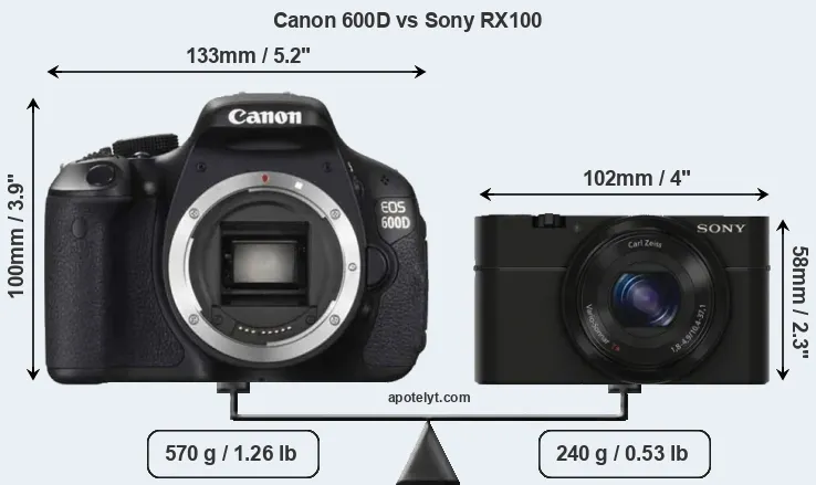 The side-by-side display below illustrates the physical size and weight of the Canon 600D and the Sony RX100. The two cameras are presented according to their relative size. Three consecutive views from the front, the top, and the rear side are shown. All width, height and depth dimensions are rounded to the nearest millimeter.