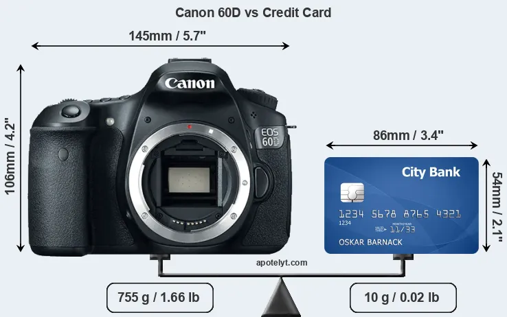 An illustration of the physical dimensions of the Canon 60D vis-à-vis a credit card is provided in the side-by-side display below. Three successive views from the front, the top, and the rear are shown. All width, height and depth dimensions are rounded to the nearest millimeter.
