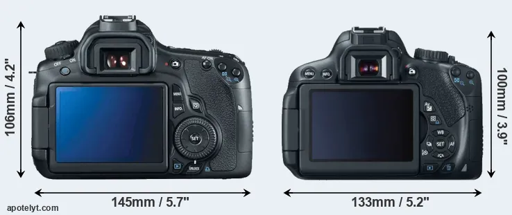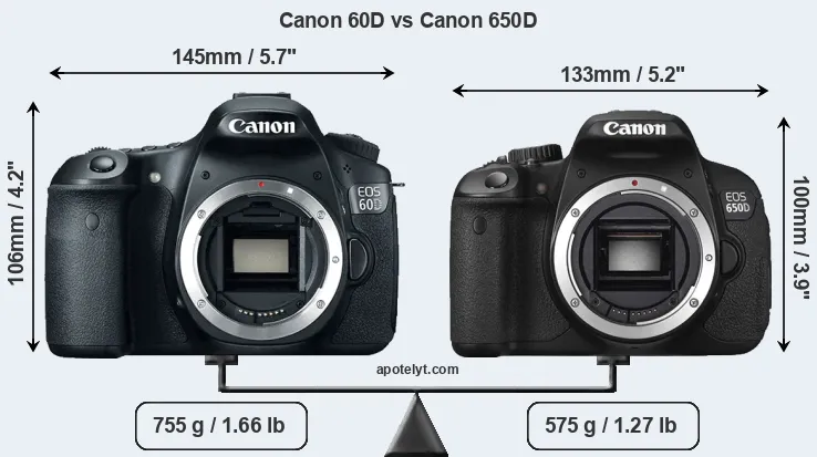An illustration of the physical size and weight of the Canon 60D and the Canon 650D is provided in the side-by-side display below. The two cameras are presented according to their relative size. Three consecutive views from the front, the top, and the rear side are shown. All width, height and depth measures are rounded to the nearest millimeter.