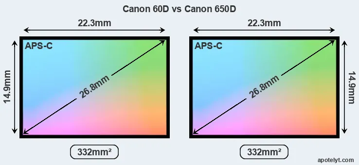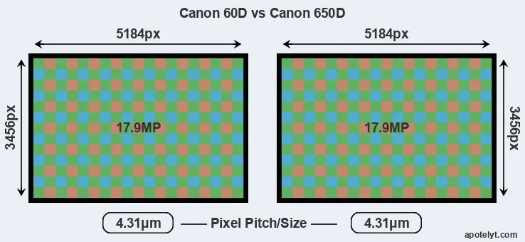 The two cameras under review do not only share the same sensor size, but also offer an identical resolution of 17.9 megapixels. This similarity in sensor specs implies that both the 60D and the 650D have the same pixel density, as well as the same pixel size. It should, however, be noted that the 650D is a somewhat more recent model (by 1 year and 9 months) than the 60D, and its sensor might have benefitted from technological advances during this time.
