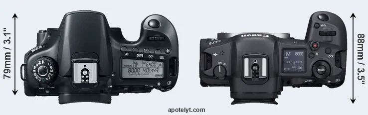An illustration of the physical size and weight of the Canon 60D and the Canon R5 is provided in the side-by-side display below. The two cameras are presented according to their relative size. Three consecutive views from the front, the top, and the rear side are shown. All size dimensions are rounded to the nearest millimeter.