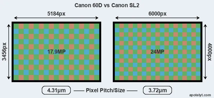 While the two cameras under review share the same sensor size, the SL2 offers a higher resolution of 24 megapixels, compared with 17.9 MP of the 60D. This megapixels advantage translates into a 16 percent gain in linear resolution. On the other hand, these sensor specs imply that the SL2 has a higher pixel density and a smaller size of the individual pixel (with a pixel pitch of 3.72μm versus 4.31μm for the 60D). However, it should be noted that the SL2 is much more recent (by 6 years and 10 months) than the 60D, and its sensor will have benefitted from technological advances during this time that compensate for the smaller pixel size.
