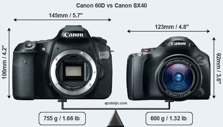 The physical size and weight of the Canon 60D and the Canon SX40 are illustrated in the side-by-side display below. The two cameras are presented according to their relative size. Three consecutive views from the front, the top, and the rear side are shown. All size dimensions are rounded to the nearest millimeter.
