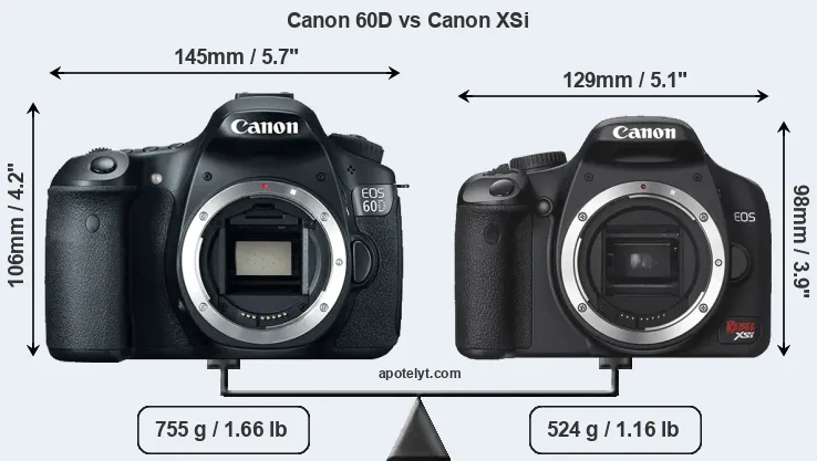 An illustration of the physical size and weight of the Canon 60D and the Canon XSi is provided in the side-by-side display below. The two cameras are presented according to their relative size. Three consecutive perspectives from the front, the top, and the back are available. All size dimensions are rounded to the nearest millimeter.
