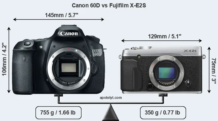 The physical size and weight of the Canon 60D and the Fujifilm X-E2S are illustrated in the side-by-side display below. The two cameras are presented according to their relative size. Three consecutive perspectives from the front, the top, and the back are available. All width, height and depth dimensions are rounded to the nearest millimeter.