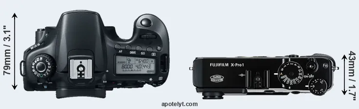 The physical size and weight of the Canon 60D and the Fujifilm X-Pro1 are illustrated in the side-by-side display below. The two cameras are presented according to their relative size. Three successive views from the front, the top, and the rear are shown. All width, height and depth measures are rounded to the nearest millimeter.