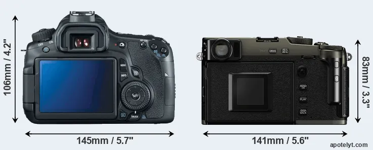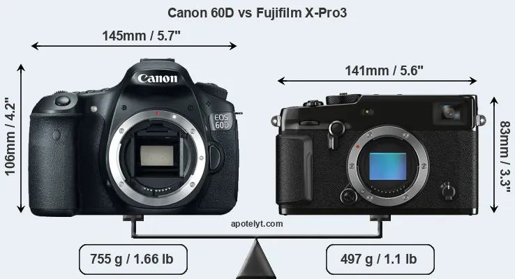 The physical size and weight of the Canon 60D and the Fujifilm X-Pro3 are illustrated in the side-by-side display below. The two cameras are presented according to their relative size. Three consecutive perspectives from the front, the top, and the back are available. All width, height and depth dimensions are rounded to the nearest millimeter.