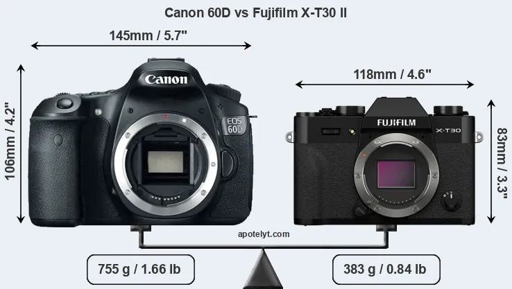 The physical size and weight of the Canon 60D and the Fujifilm X-T30 II are illustrated in the side-by-side display below. The two cameras are presented according to their relative size. Three consecutive perspectives from the front, the top, and the back are available. All width, height and depth dimensions are rounded to the nearest millimeter.