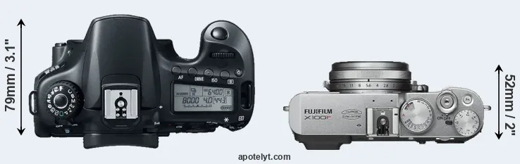 If the front view area (width x height) of the cameras is taken as an aggregate measure of their size, the Fujifilm X100F is considerably smaller (38 percent) than the Canon 60D. It is worth mentioning in this context that the 60D is splash and dust resistant, while the X100F does not feature any corresponding weather-sealing.