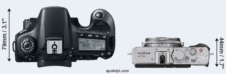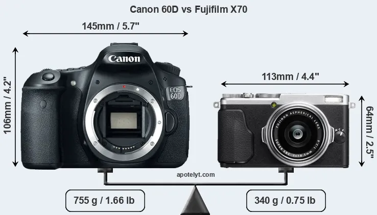 The side-by-side display below illustrates the physical size and weight of the Canon 60D and the Fujifilm X70. The two cameras are presented according to their relative size. Three successive views from the front, the top, and the rear are shown. All width, height and depth dimensions are rounded to the nearest millimeter.