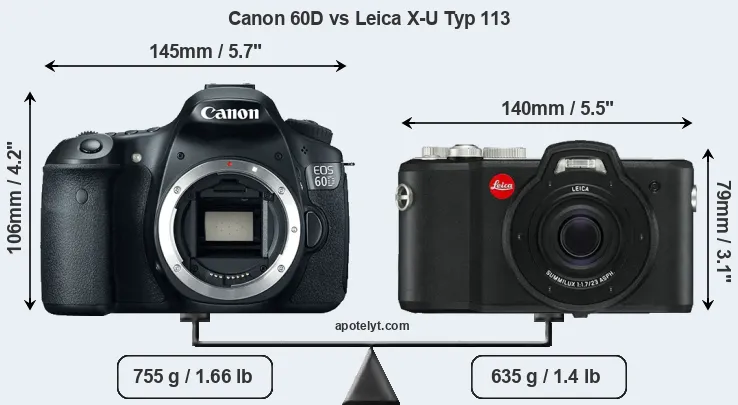 The side-by-side display below illustrates the physical size and weight of the Canon 60D and the Leica X-U Typ 113. The two cameras are presented according to their relative size. Three consecutive perspectives from the front, the top, and the back are available. All width, height and depth dimensions are rounded to the nearest millimeter.