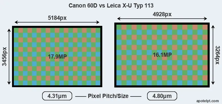 Despite having a smaller sensor, the Canon 60D offers a higher resolution of 17.9 megapixels, compared with 16.1 MP of the Leica X-U Typ 113. This megapixels advantage comes at the cost of a higher pixel density and a smaller size of the individual pixel (with a pixel pitch of 4.31μm versus 4.80μm for the X-U Typ 113). Moreover, it should be noted that the X-U Typ 113 is much more recent (by 5 years and 4 months) than the 60D, and its sensor will have benefitted from technological advances during this time that further enhance the light gathering capacity of its pixel-units.
