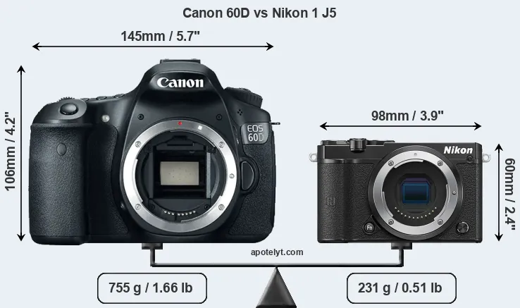 The physical size and weight of the Canon 60D and the Nikon 1 J5 are illustrated in the side-by-side display below. The two cameras are presented according to their relative size. Three successive views from the front, the top, and the rear are shown. All width, height and depth dimensions are rounded to the nearest millimeter.
