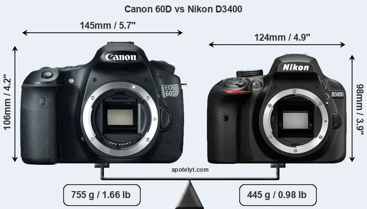 If the front view area (width x height) of the cameras is taken as an aggregate measure of their size, the Nikon D3400 is notably smaller (21 percent) than the Canon 60D. Moreover, the D3400 is substantially lighter (41 percent) than the 60D. It is worth mentioning in this context that the 60D is splash and dust resistant, while the D3400 does not feature any corresponding weather-sealing.