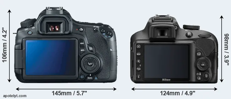 Going beyond this snapshot of core features and characteristics, what are the differences between the Canon EOS 60D and the Nikon D3400? Which one should you buy? Read on to find out how these two cameras compare with respect to their body size, their imaging sensors, their shooting features, their input-output connections, and their reception by expert reviewers.