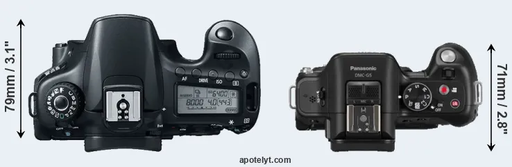 An illustration of the physical size and weight of the Canon 60D and the Panasonic G5 is provided in the side-by-side display below. The two cameras are presented according to their relative size. Three consecutive perspectives from the front, the top, and the back are available. All width, height and depth dimensions are rounded to the nearest millimeter.