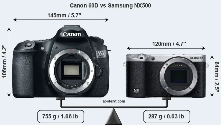 If the front view area (width x height) of the cameras is taken as an aggregate measure of their size, the Samsung NX500 is considerably smaller (50 percent) than the Canon 60D. Moreover, the NX500 is substantially lighter (62 percent) than the 60D. It is worth mentioning in this context that the 60D is splash and dust resistant, while the NX500 does not feature any corresponding weather-sealing.